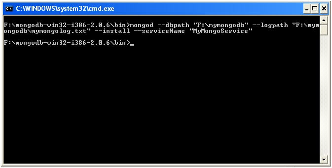 - Open the Command prompt (cmd) and change the directory to mongodb-win32-i386-2.0.6 and follow the below steps shown in screenshot :-