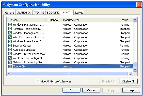 - Run the msconfig command and see the mongo service listing or open window service from control panel,