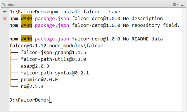- Falcor module can be installed using npm install falcor –save command.The following screenshot shows the terminal with falcor installation.