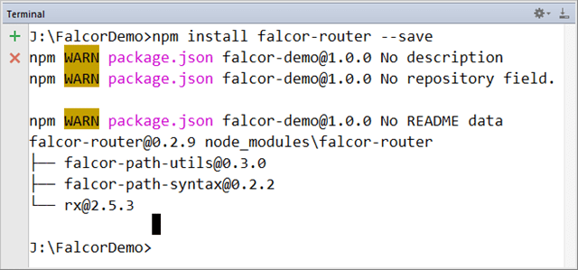 - falcor-router can be installed locally using npm install falcor-router –save command.The following screenshot shows the terminal with falcor router module installation.