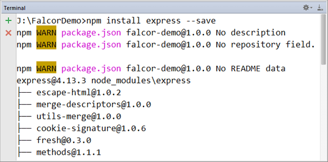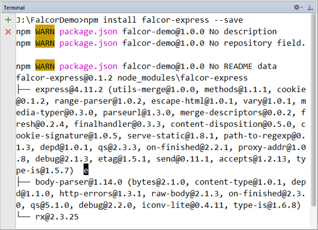 - falcor-express can be installed using npm install falcor-express –save command.The following screenshot shows the terminal with falcor express module installation.